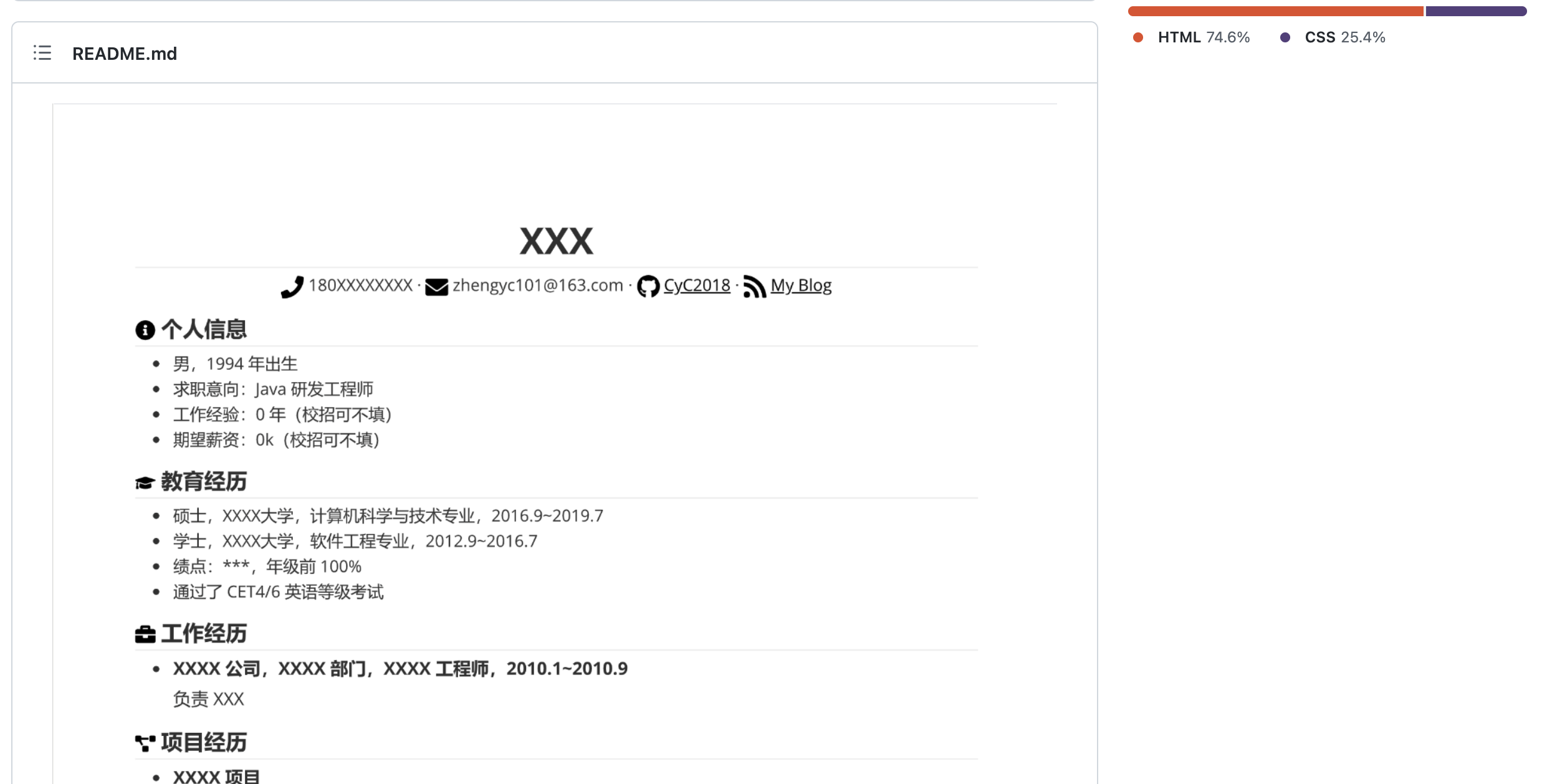 本项目的markdown简历模引用自:https://github.com/CyC2018/Markdown-Resume 如果你只是想在本地使用这个模板,我推荐你看:https://github.com/CyC2018/Markdown-Resume#readme
